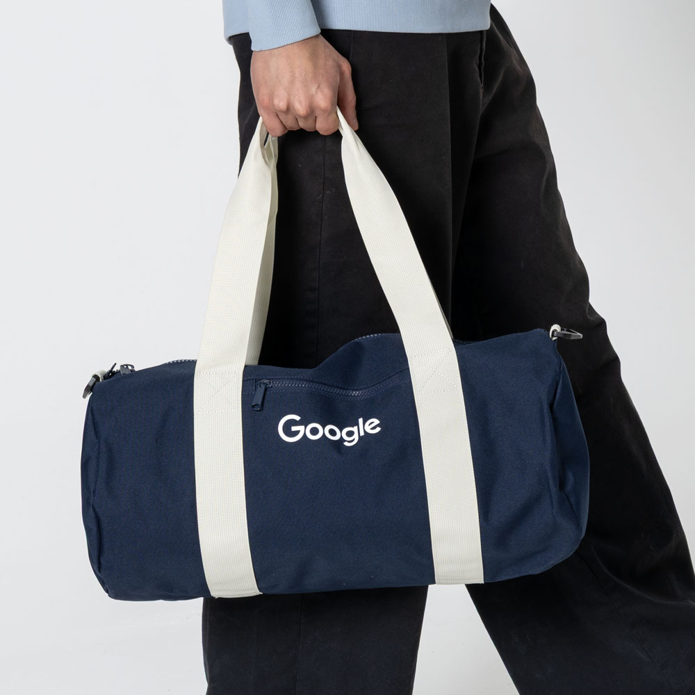 Practical navy barrel bag with white trim for everyday use with a zippered main compartment as well as a small pouch to the front. Detachable and fully adjustable shoulder strap with webbed carry handles. Branded with the Google logo in white.