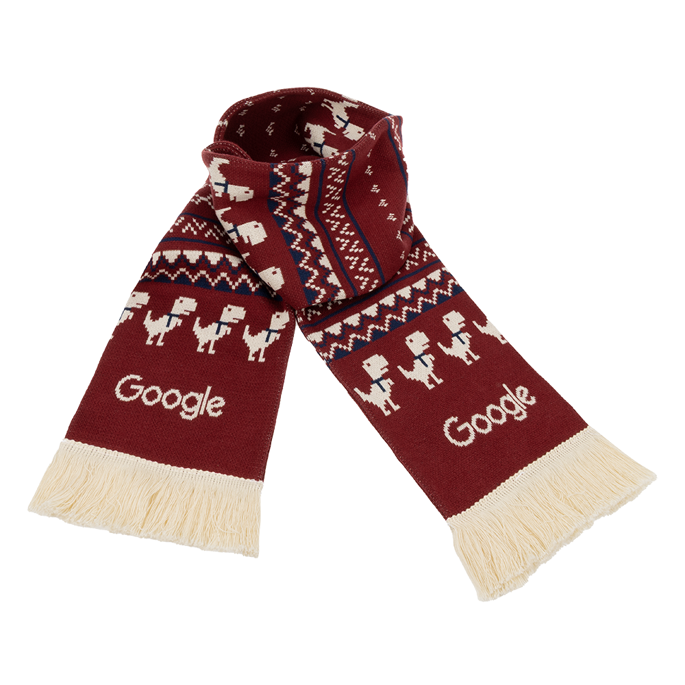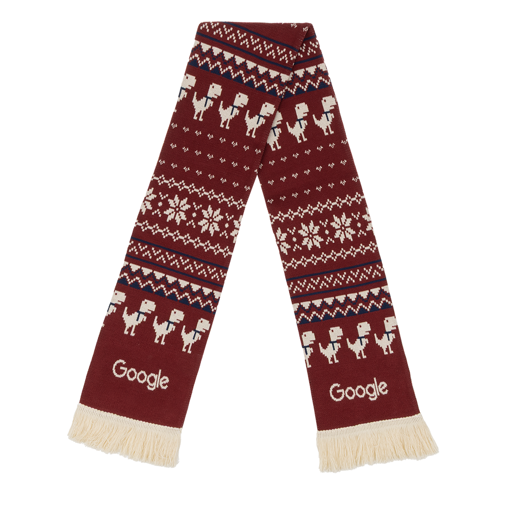 This warming cotton scarf is decorated with a festive pattern and features the Chrome Dino, the Google logo and tassels to each end.