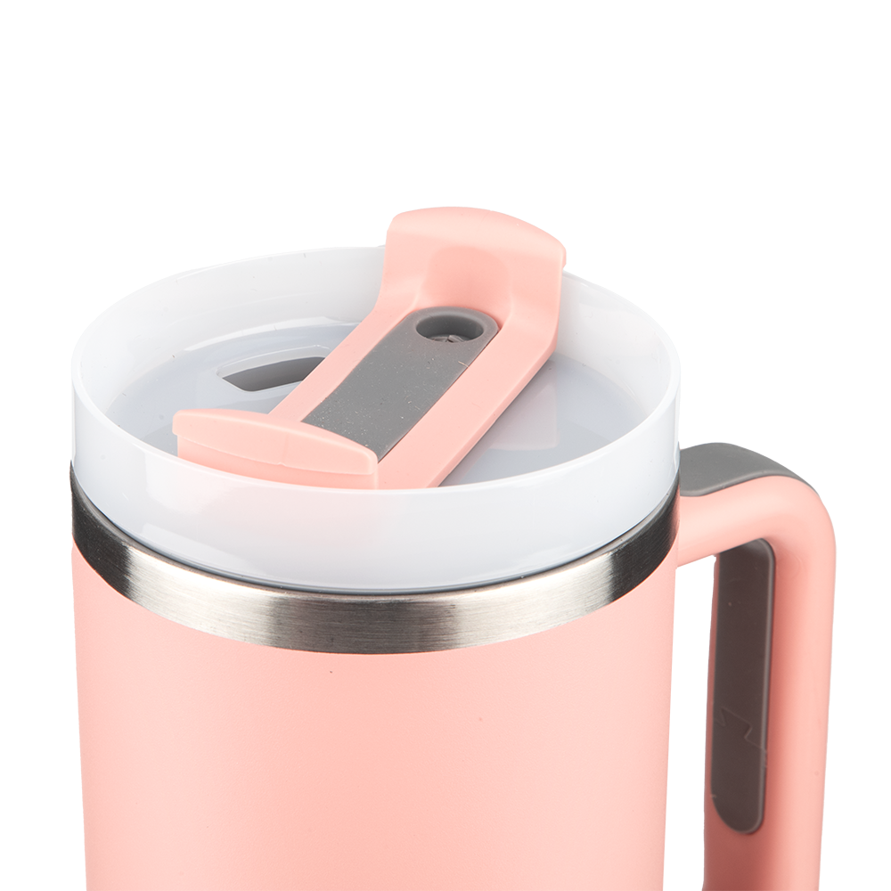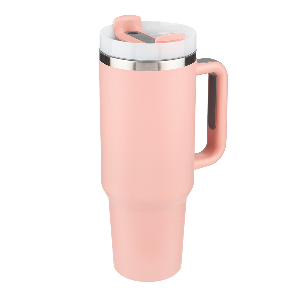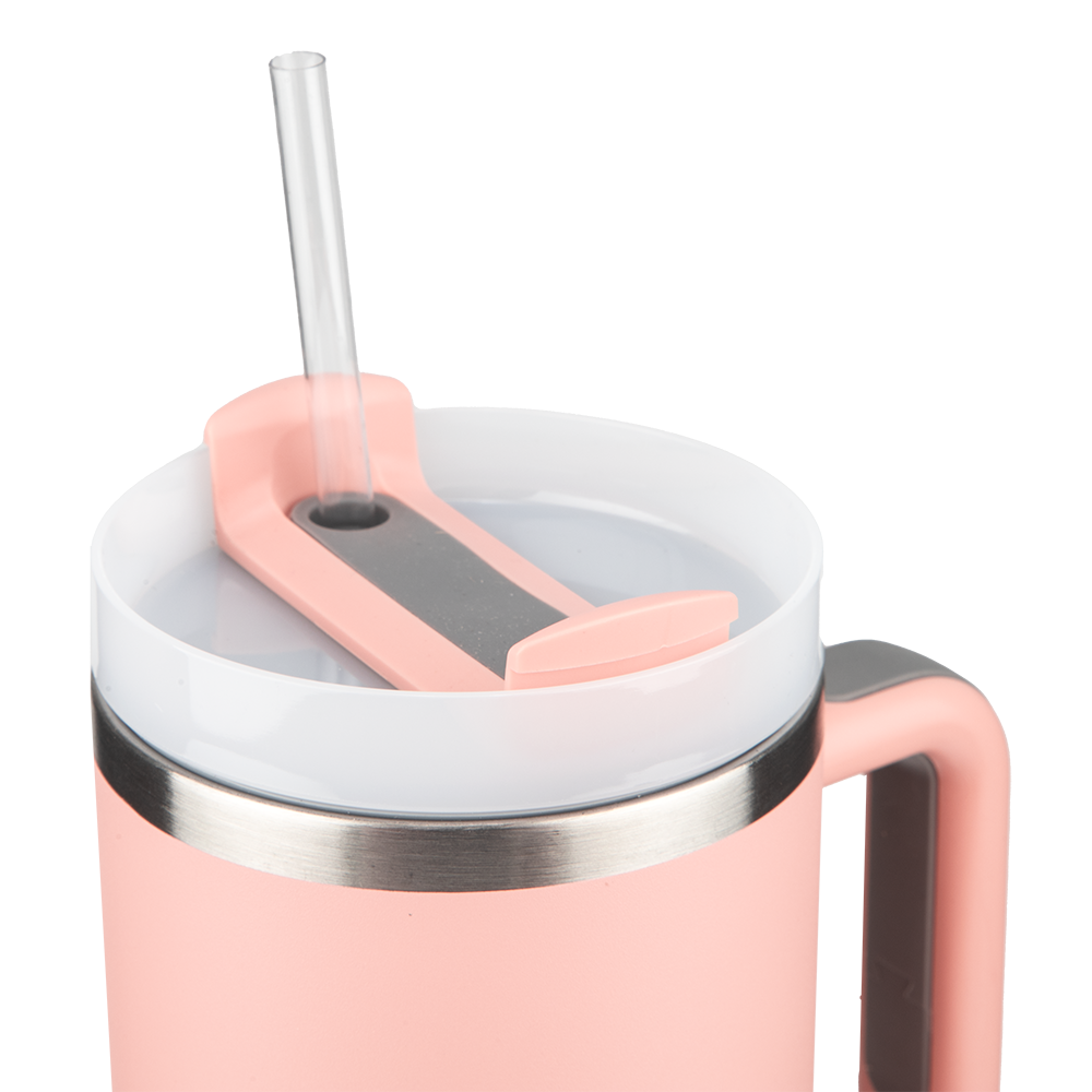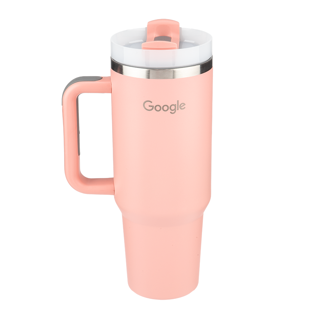 This light pink tumbler is a viral sensation. Engineered for excellence with a double-wall construction to maintain the temperature of your drinks for longer, a handle for holding and a straw for easy drinking. Branded with the Google logo.