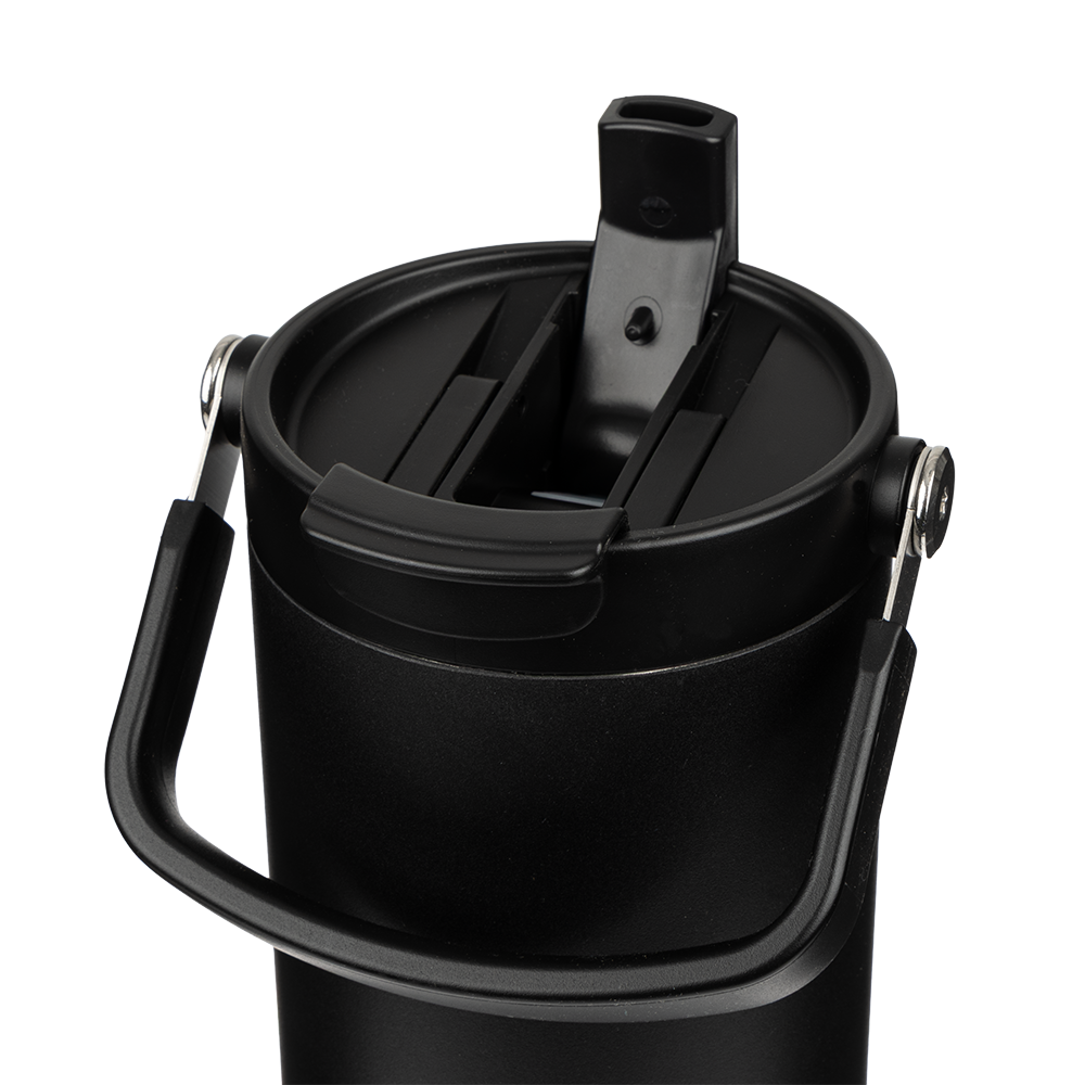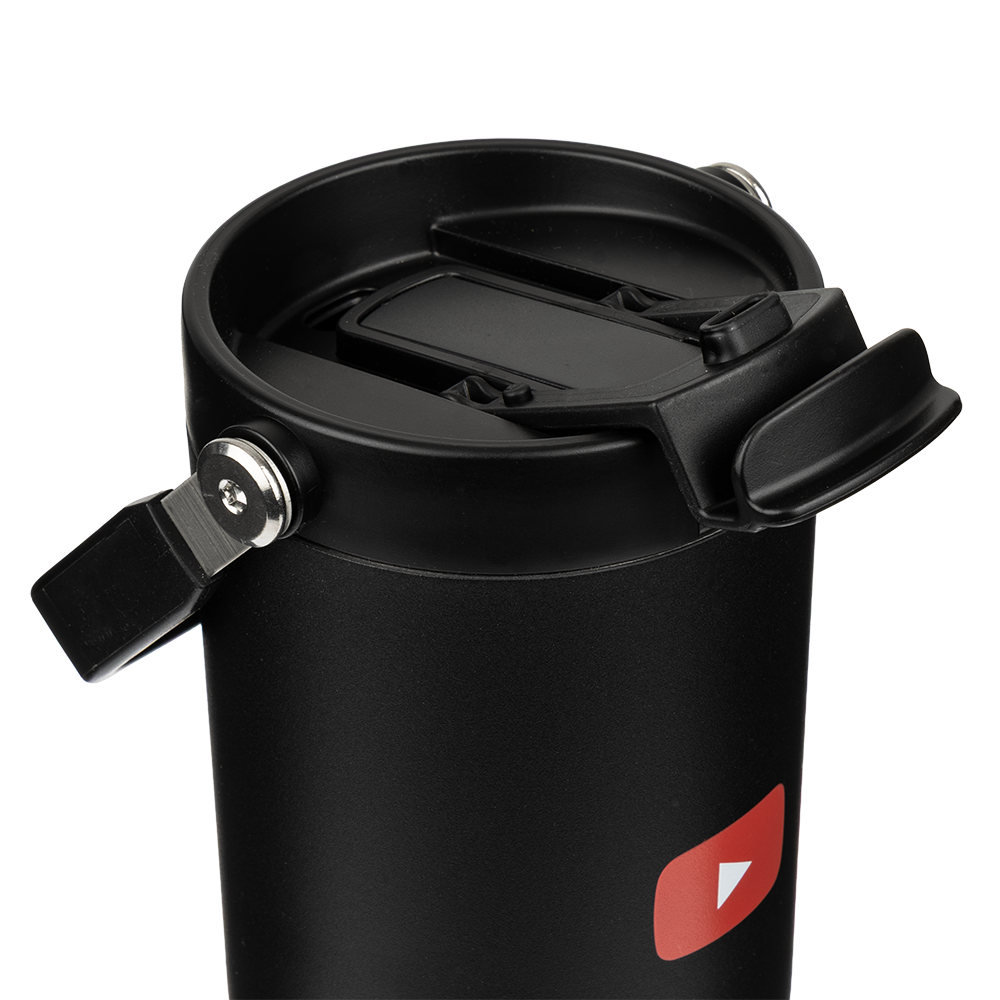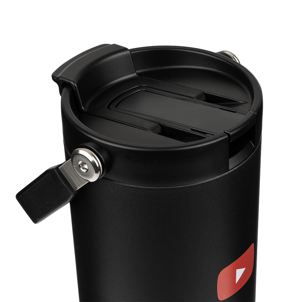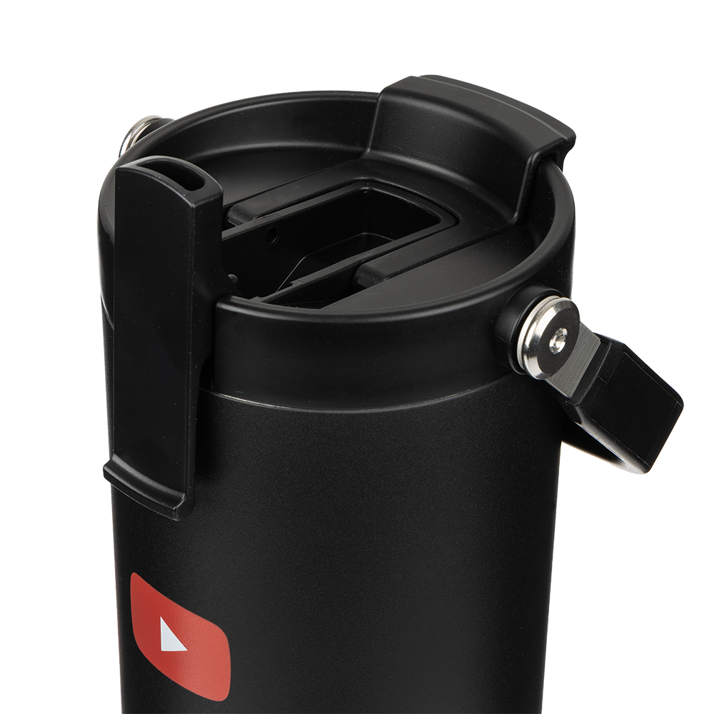 Large insulated tumbler with a carry-handle and collapsible straw for the ultimate convenient hydration. This impressive bit of kit keeps drinks hot for up to 12 hours and cold for up to 24 hours. Branded with the YouTube logo.